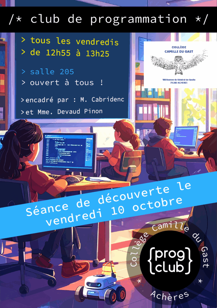 Inauguré en 2014, le collège Camille du Gast accueille 480 élèves de la 6e à la 3e dans un cadre agréable et propice au travail. Très bien situé à proximité immédiate de la gare de RER d’Achères, le collège, labellisé haute qualité environnementale, dispose d’un équipement numérique de qualité au service des apprentissages. Soucieux des conditions de travail des élèves, il propose également une offre éducative riche et ambitieuse tant dans le domaine des langues (6e bilangue allemand/anglais, option LCE anglais et latin) que dans le domaine sportif et artistique (section sportive handball, option chant choral). Nous vous invitons à parcourir ces pages pour mieux le découvrir…
