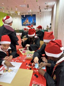 Parmi les épreuves, les élèves ont dû retrouver le vocabulaire du corps humain pendant que leurs parrains et marraines cousaient une chaussette en feutrine (petit clin d’œil à Hermione), puis assembler un petit casse-noisette en lego et enfin réaliser différentes opérations en chiffres romains pour trouver les jambes de leur lutin dissimulé sur le parking du collège.