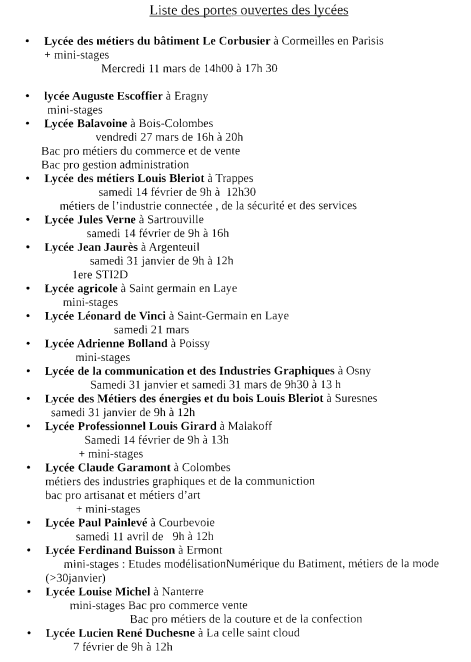 Veuillez trouver ci-joint une liste des portes ouvertes des lycées professionnels alentours ! ...